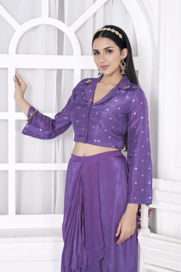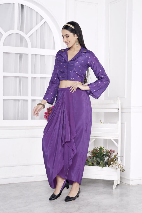 Elevate your elegance ✨ A fusion of structure and flow, this blazer top with a draped skirt is adorned with delicate hand-embroidered butti on the collar, bringing a touch of tradition to a contemporary silhouette. Perfect for those who love a bold statement with a hint of grace. #FashionReels #HandEmbroidery #ModernElegance #BlazerAndSkirt”