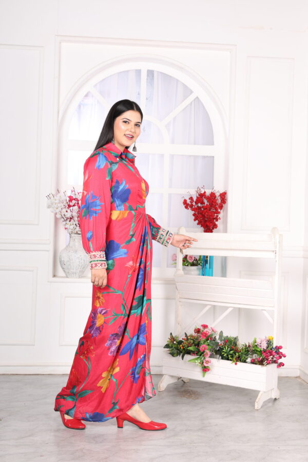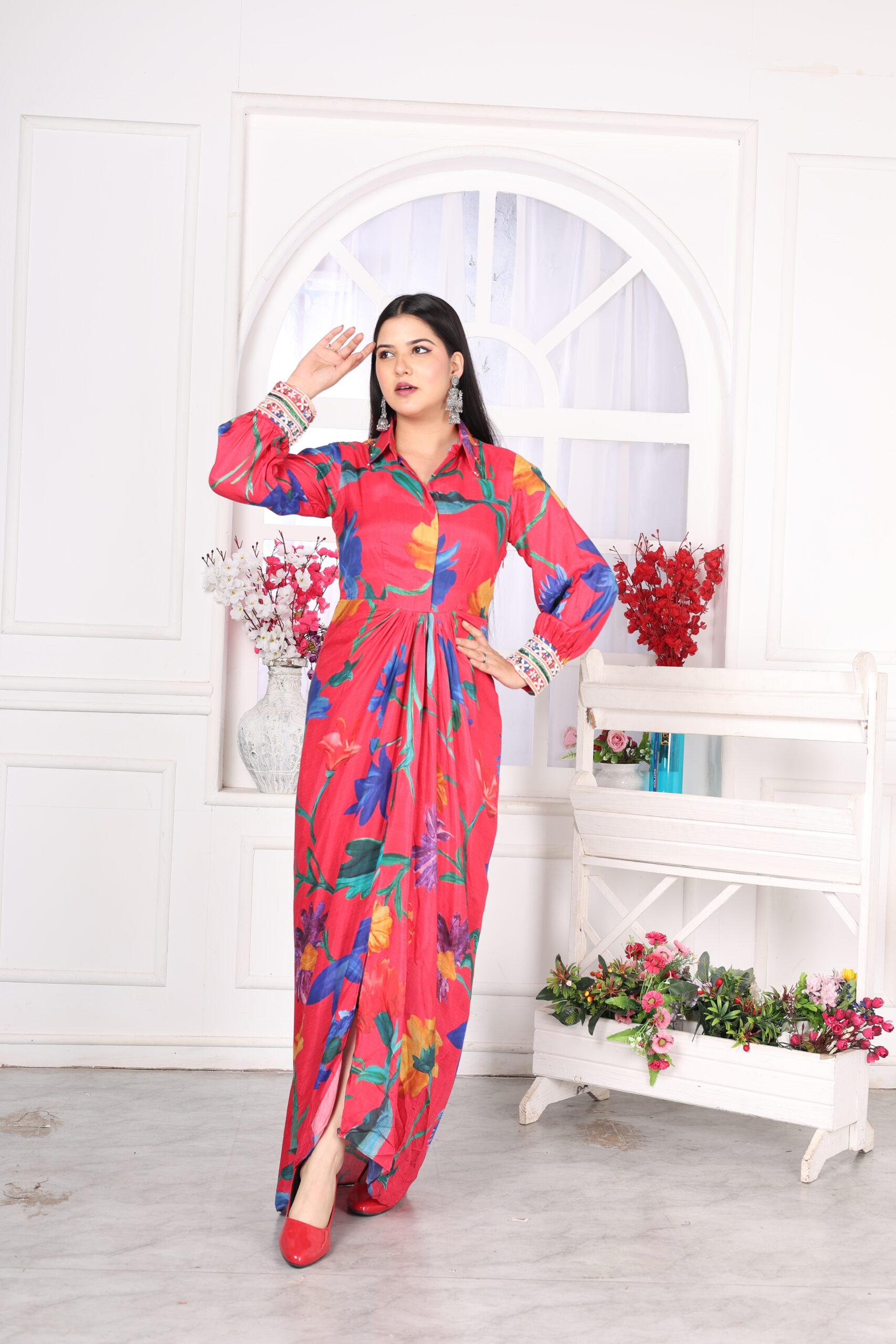 The Premium Muslin Floral Drape Tunic is a sophisticated and elegant piece designed to elevate your wardrobe. Crafted from high-quality muslin fabric, the tunic features a flowing drape that ensures a graceful silhouette, perfect for both casual and formal occasions. The all-over floral print adds a touch of femininity, while the puffed sleeves bring a modern, stylish flair to the design.