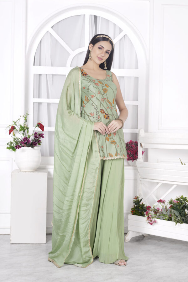 Step into elegance with our Green Floral Princess Cut Sharara Set 🌿✨ Perfectly adorned with intricate hand embroidery, this outfit highlights timeless beauty and craftsmanship. The delicate floral design and detailed work on the front make it a must-have for festive occasions. Feel like royalty in every step with this stunning sharara set that blends tradition with modern grace! 💚 #ShararaSet #HandEmbroidery #TraditionalElegance