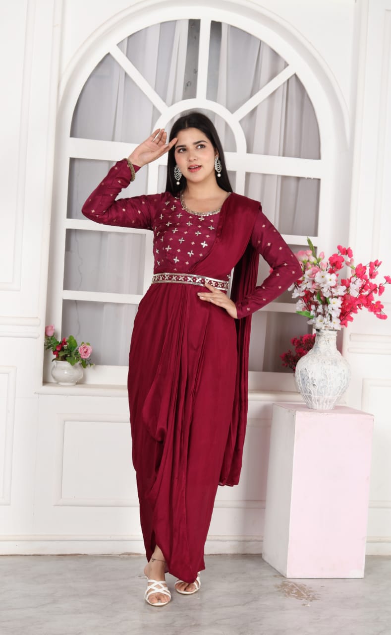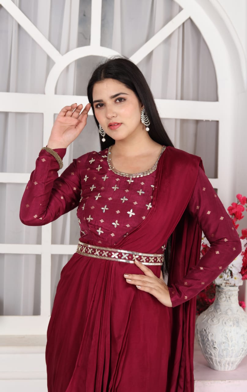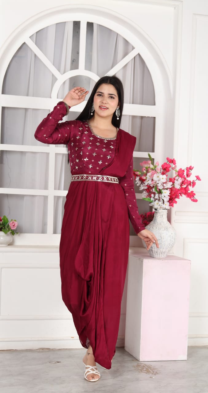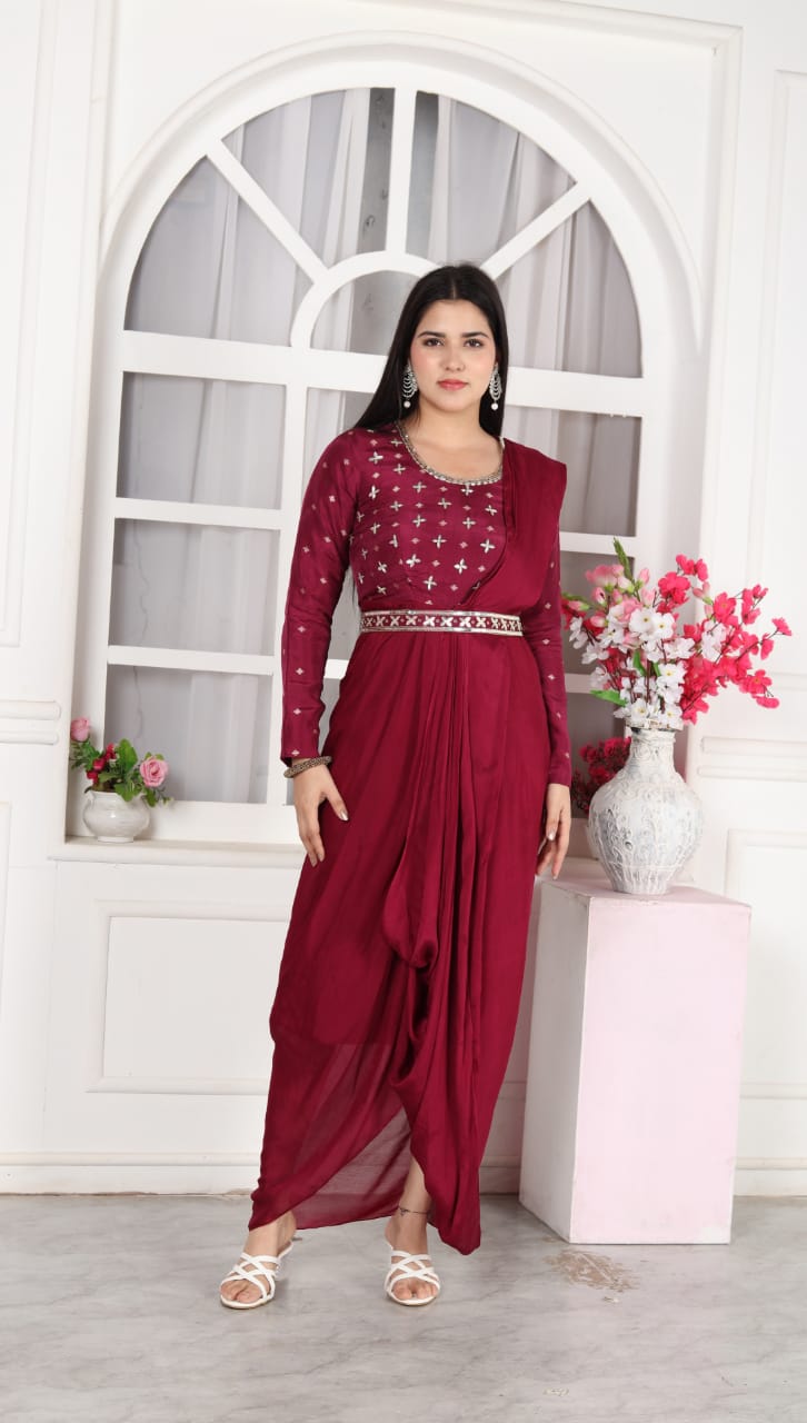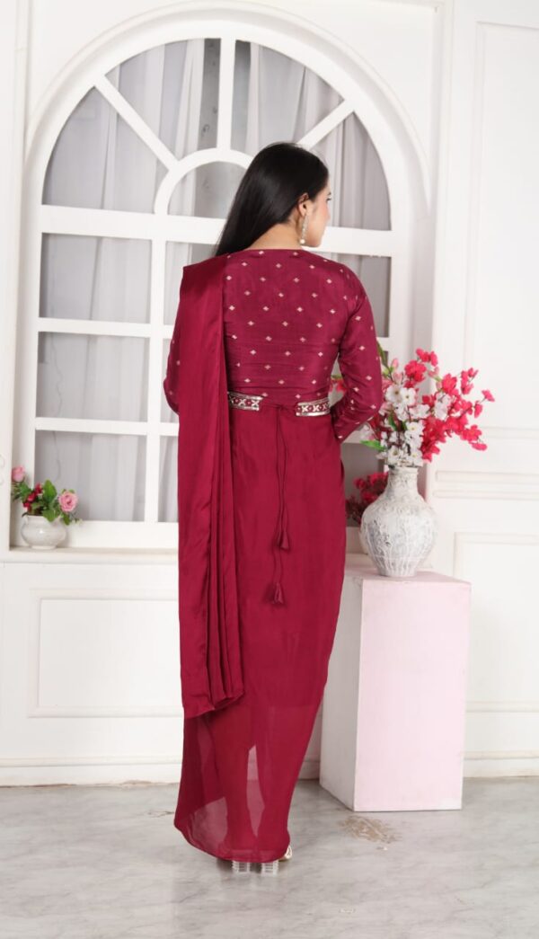 Unveiling elegance in every fold! 💜✨ This stunning  maroon saree draped  in a chic Indo-Western style features exquisite hand-embroidered detailing on the yoke and a handcrafted belt cinching the waist to perfection. A perfect blend of tradition and contemporary fashion! 💃