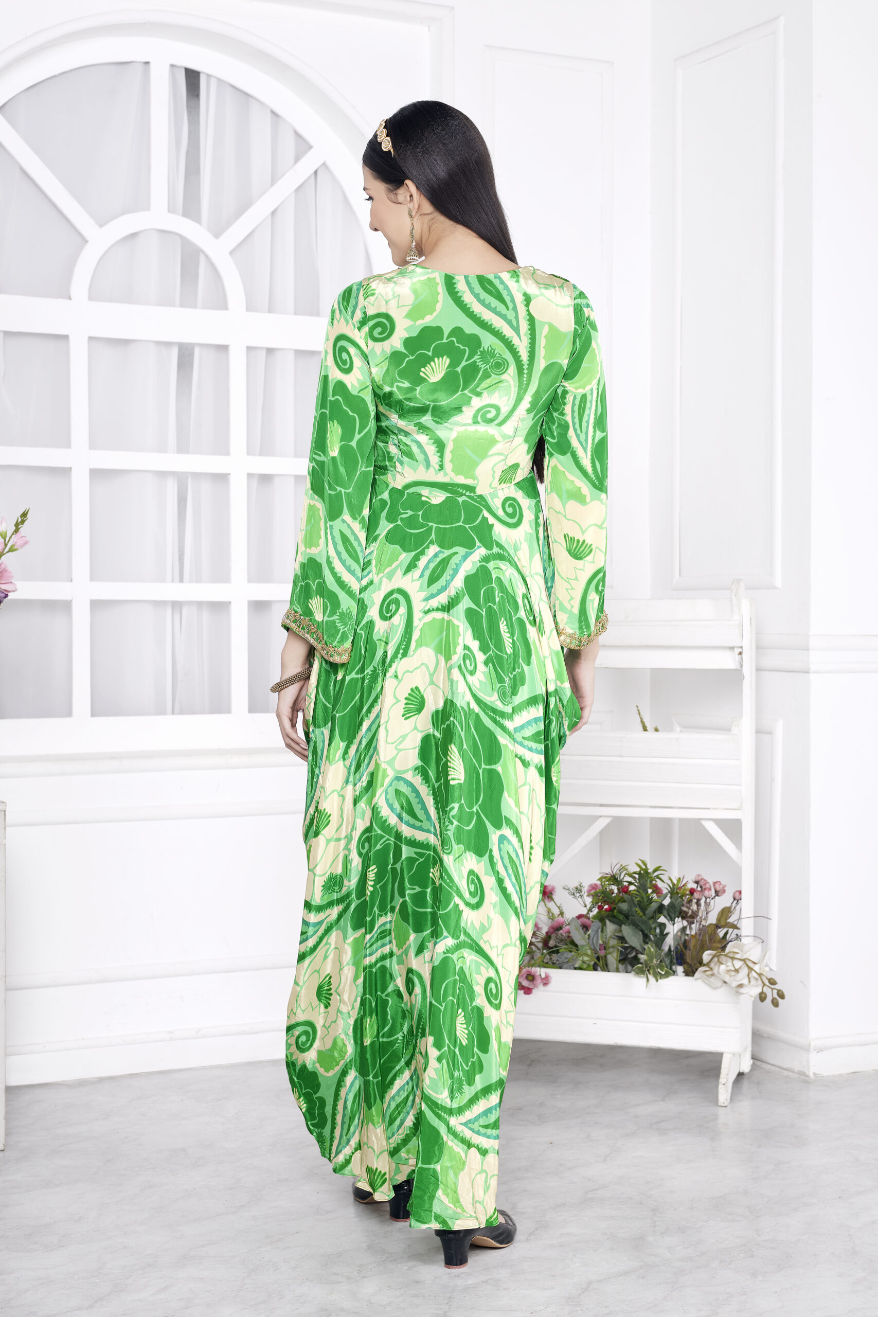 Embrace timeless elegance with this stunning paisley print drape! Crafted in luxurious natural crepe with a digital print, the intricate hand embroidery on the neckline and sleeves adds a touch of artistry and sophistication. The flared silhouette offers a graceful flow, perfect for any special occasion. A beautiful fusion of traditional charm and modern design. ✨ #PaisleyPrint #HandEmbroidery #CrepeDrape #FashionElegance #TraditionalWear #StyleInspiration”