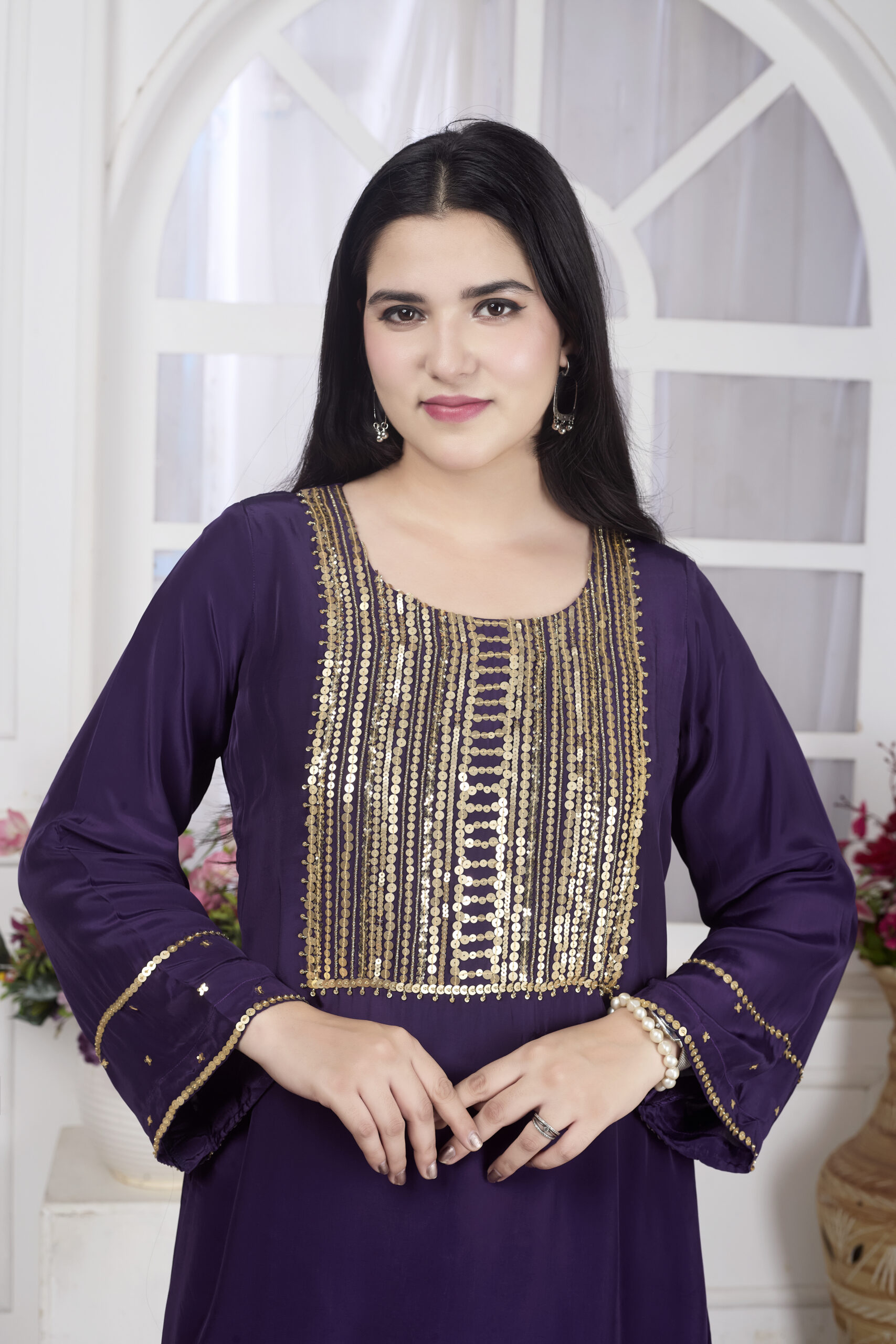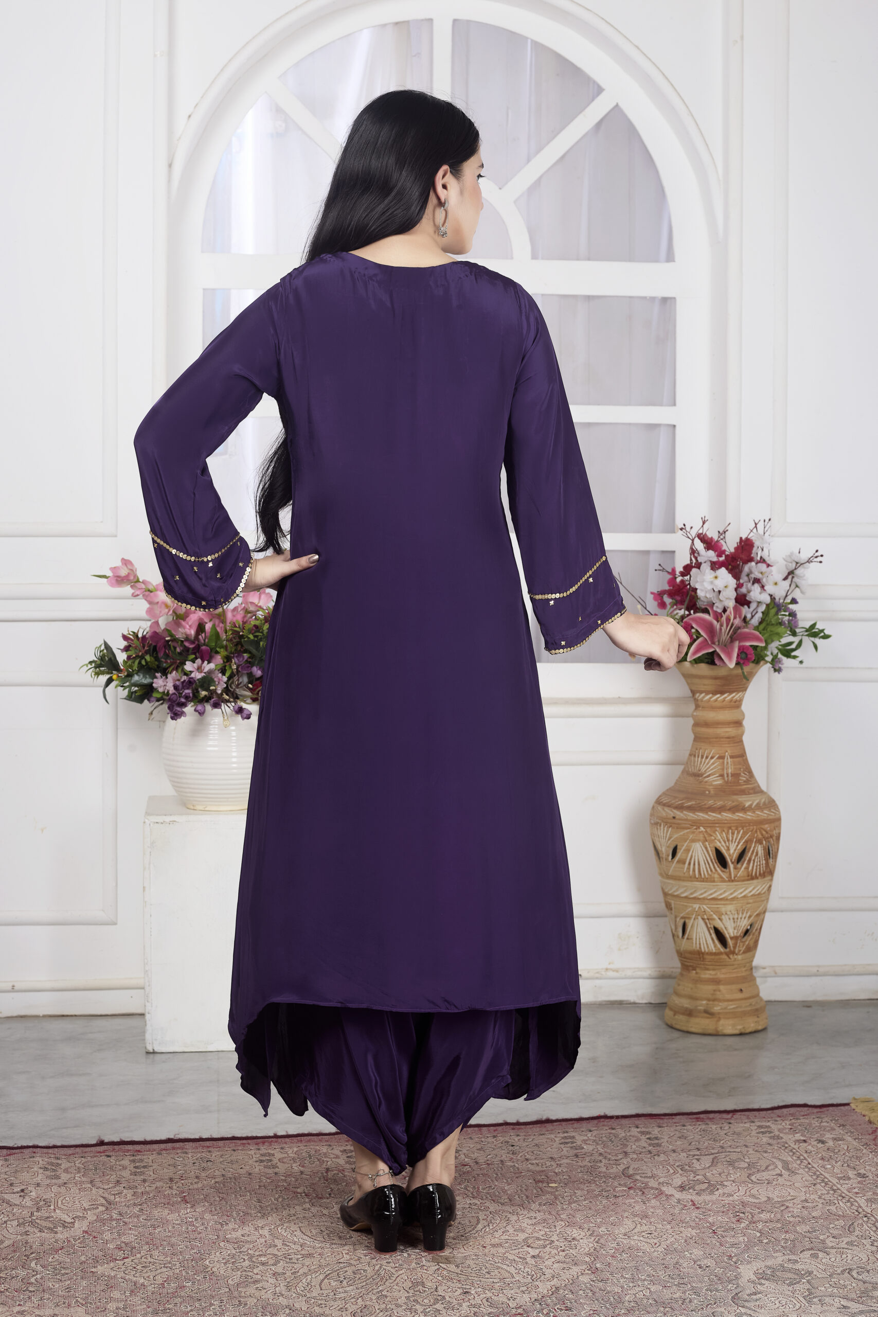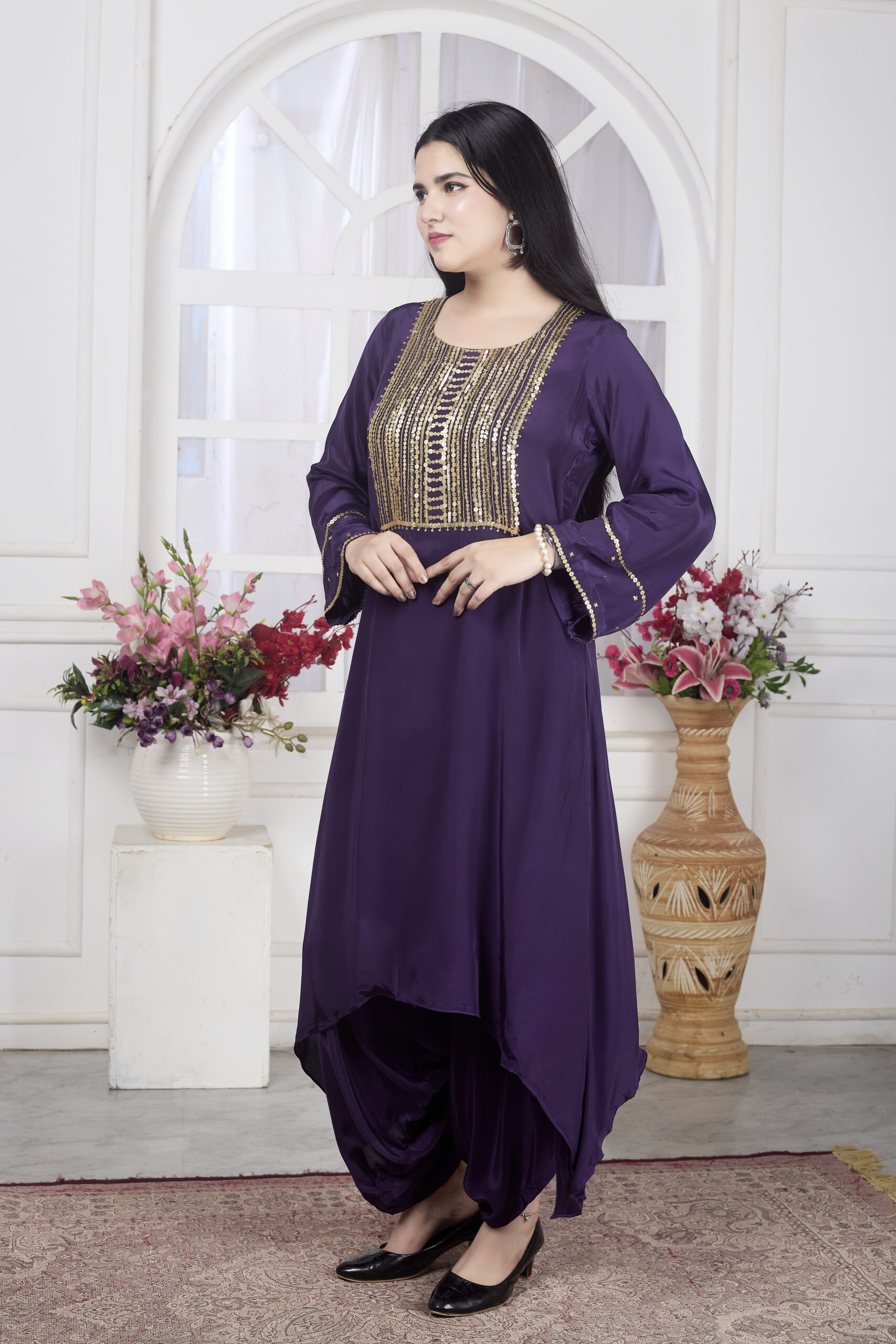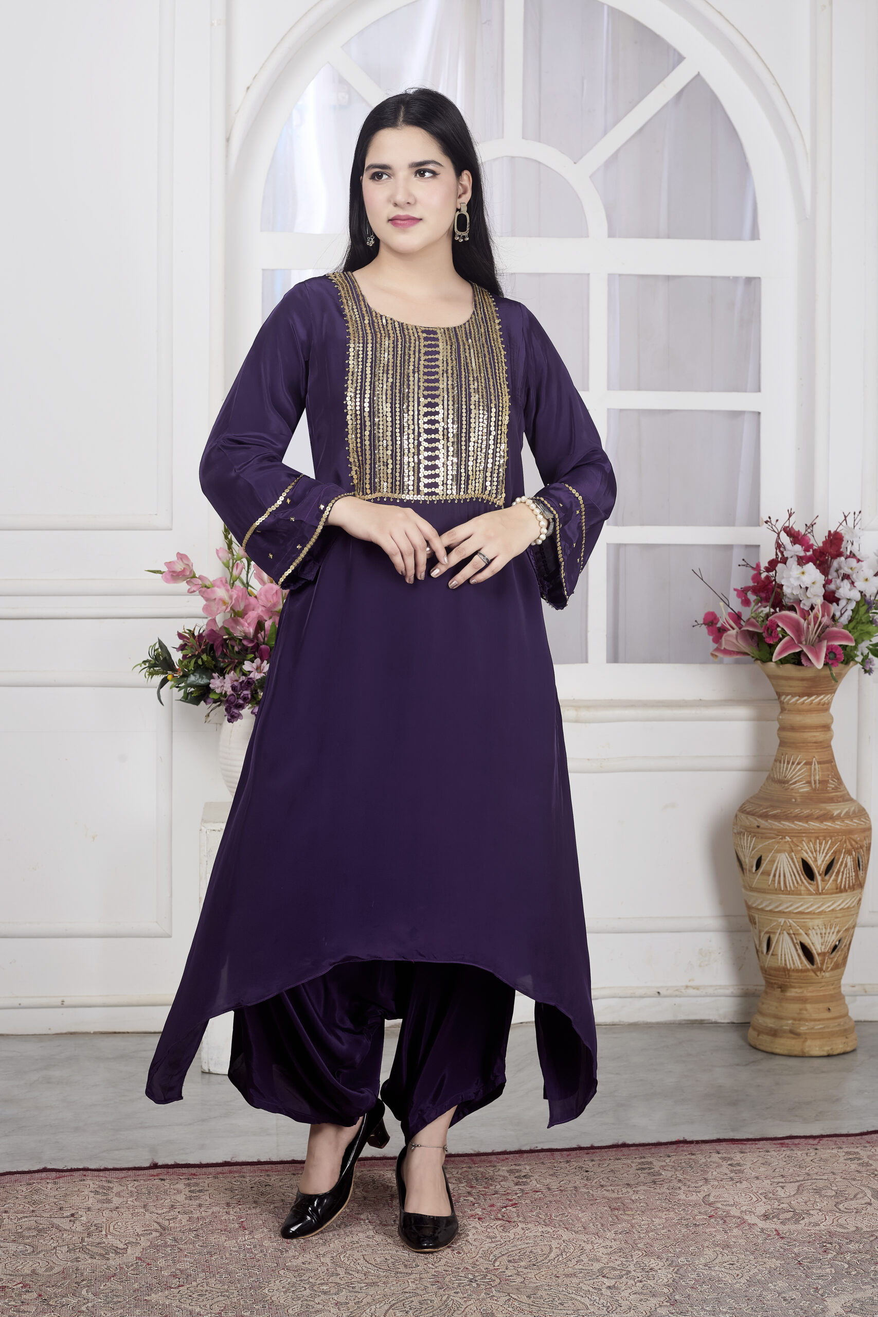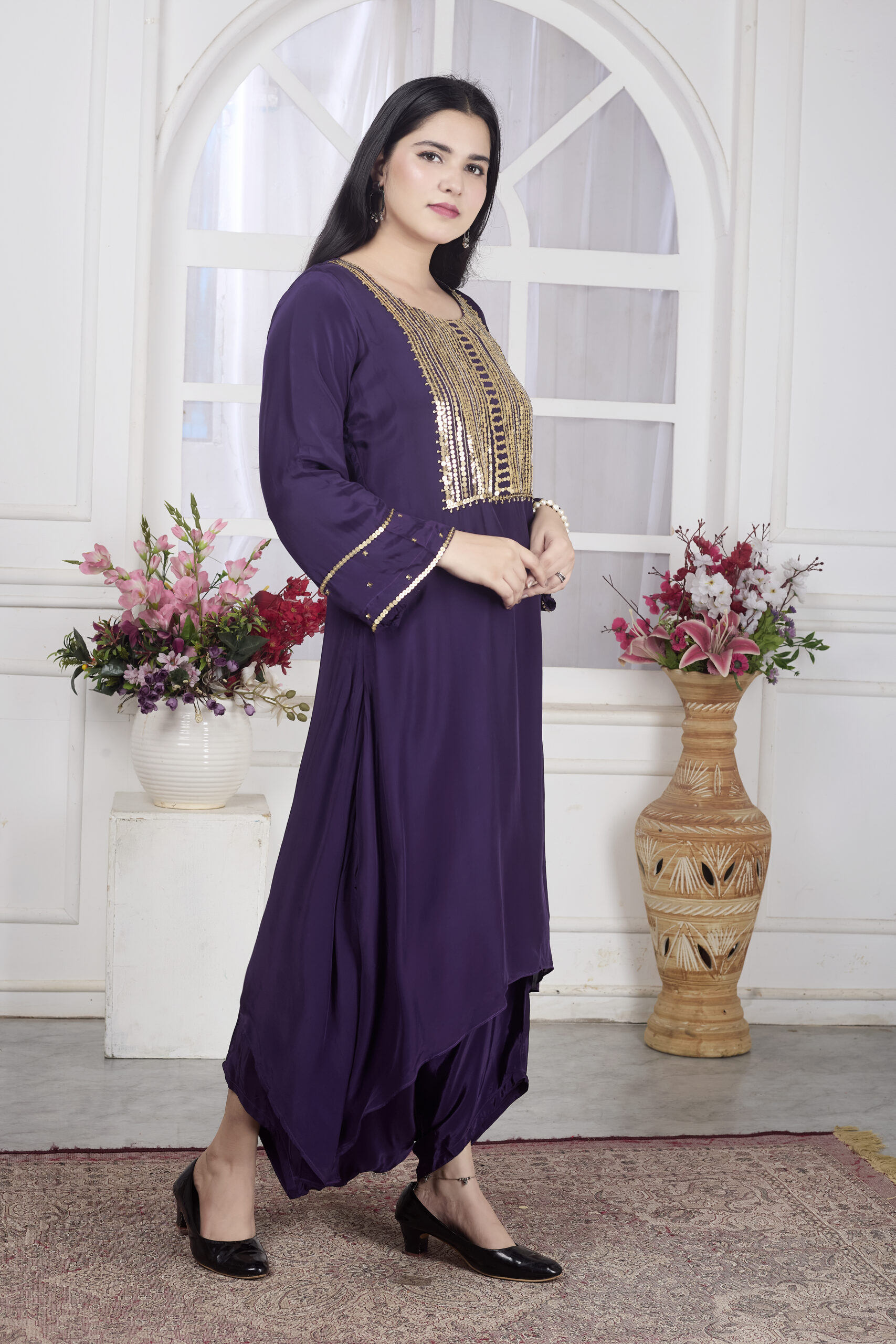 This stunning purple asymmetric set features an exquisitely hand-embroidered yoke and finely detailed sleeves, bringing a perfect balance of tradition and modern design. The rich purple tone paired with artisanal embroidery makes it an effortless statement for festive soirées and wedding celebrations.