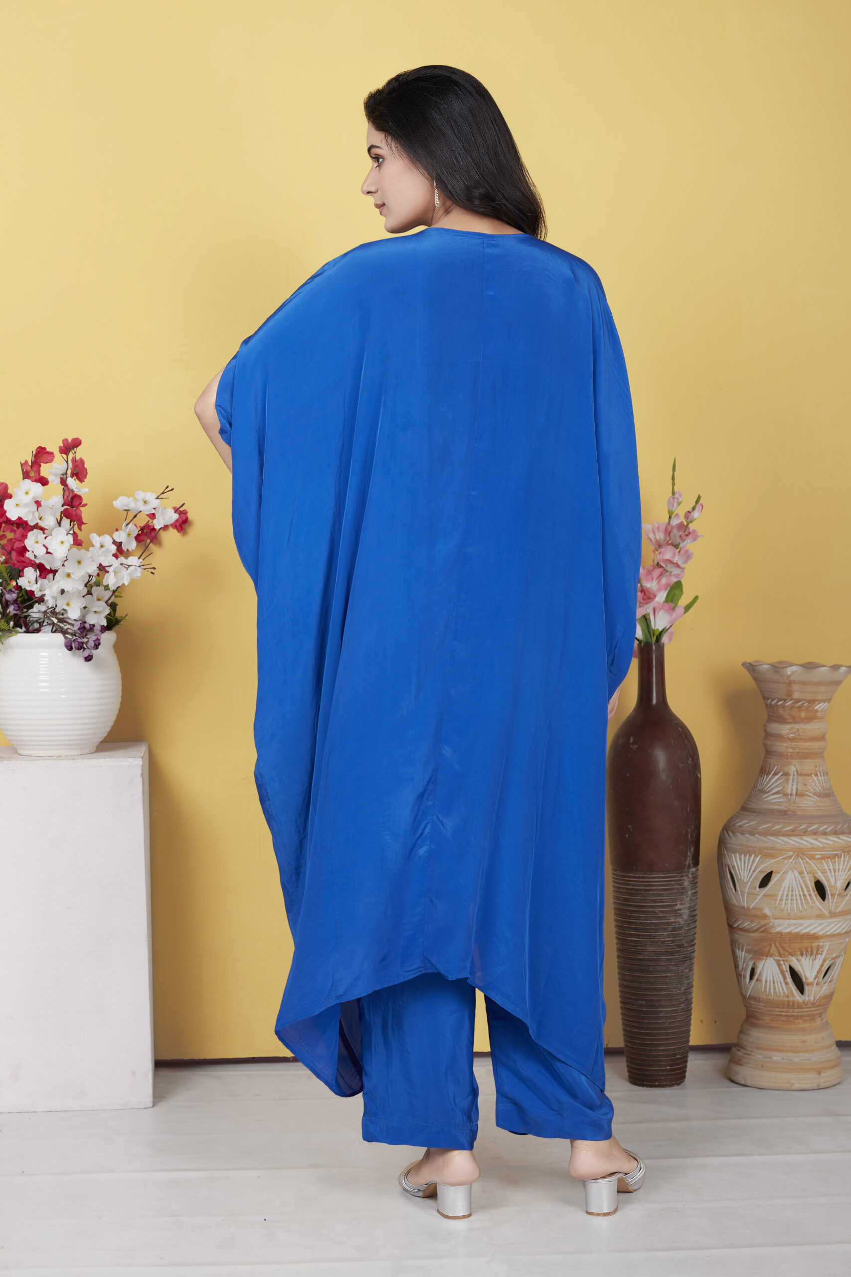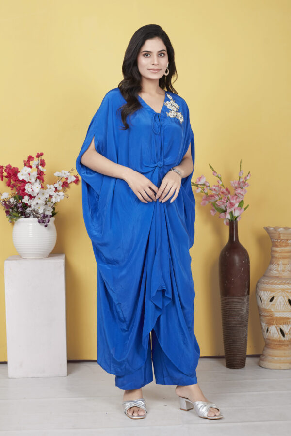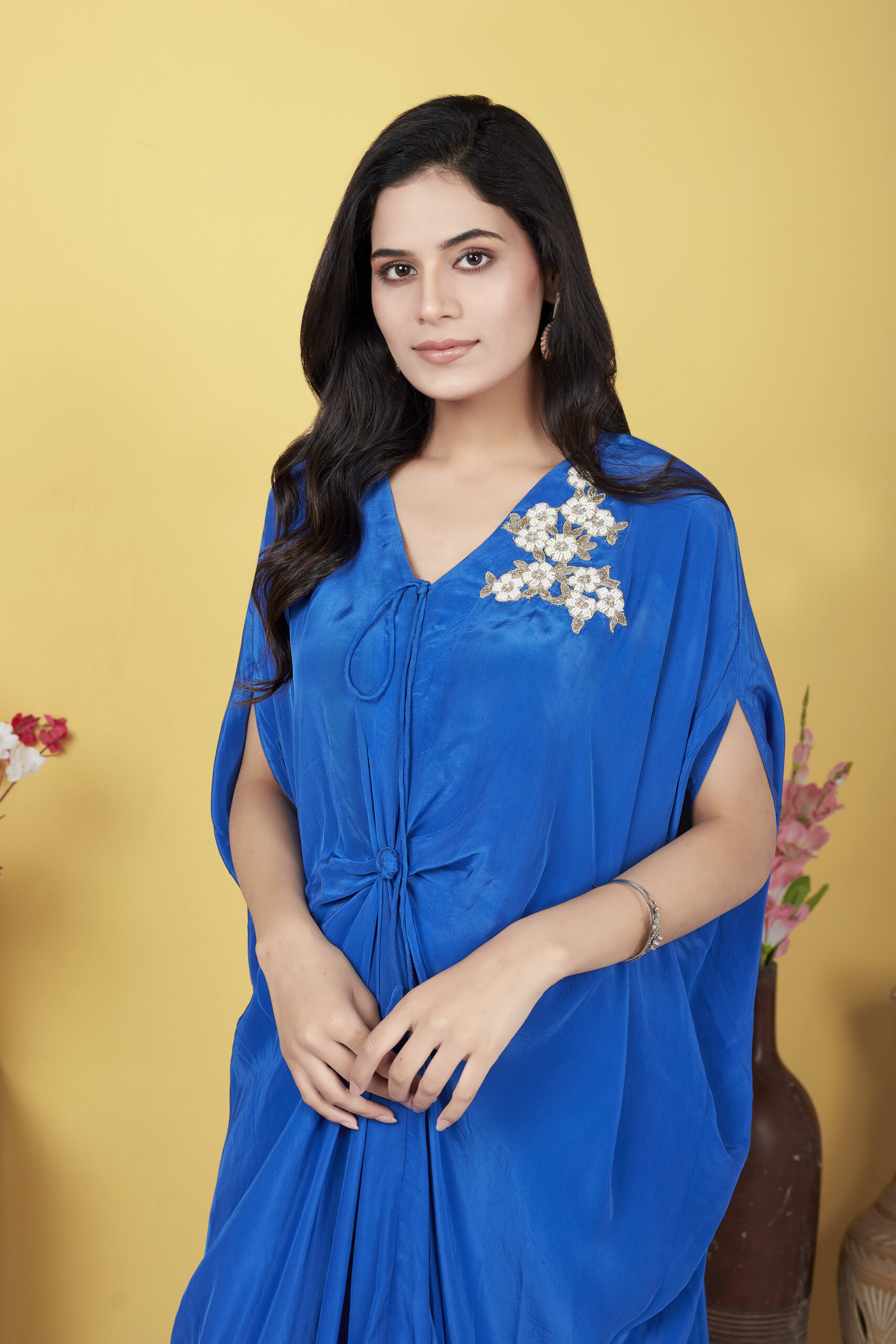 Whether worn as a chic standalone piece or layered over your favorite outfit, this Royal Blue Crepe Dress Drape Kaftan is a timeless addition to your wardrobe that radiates effortless beauty and elegance.
