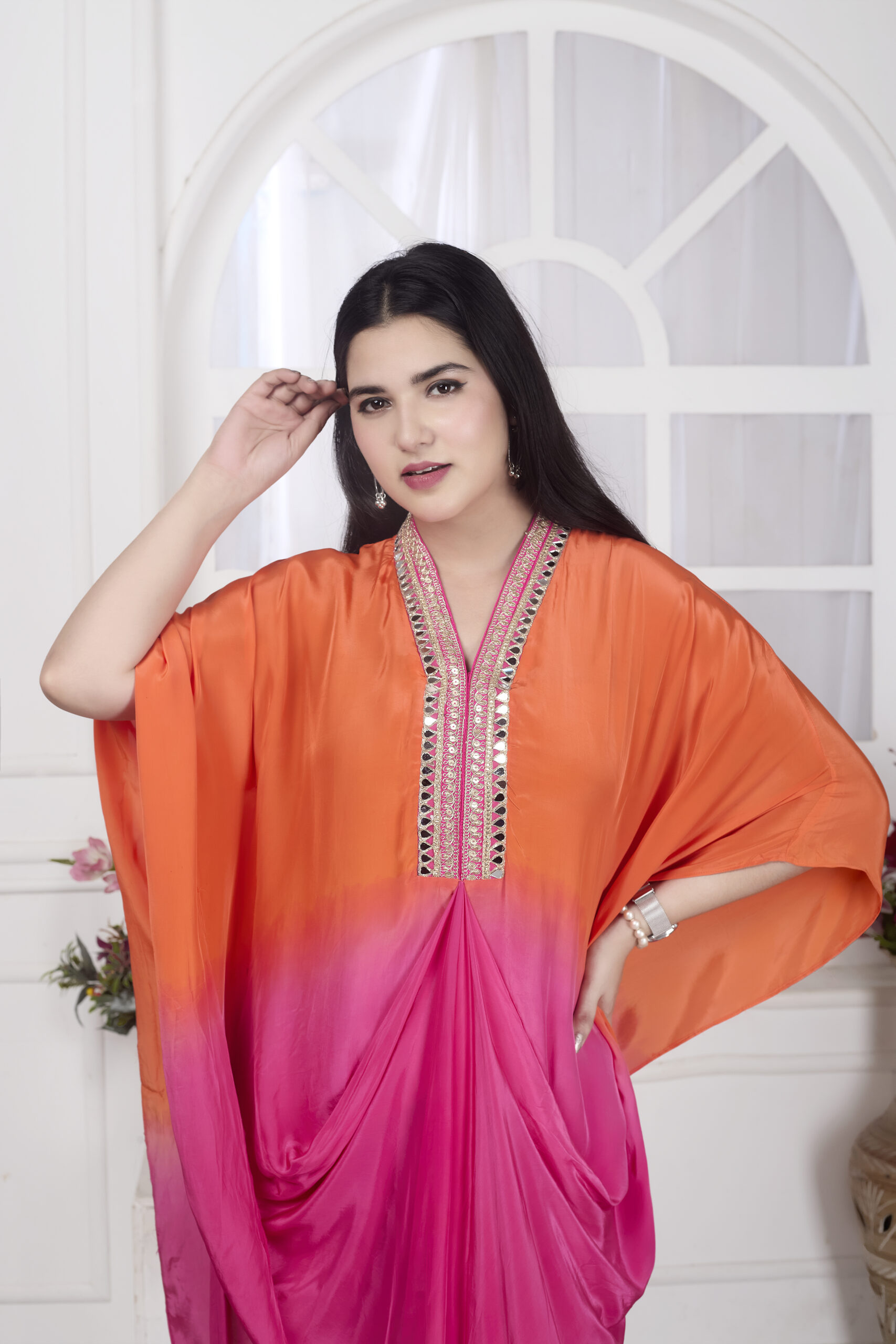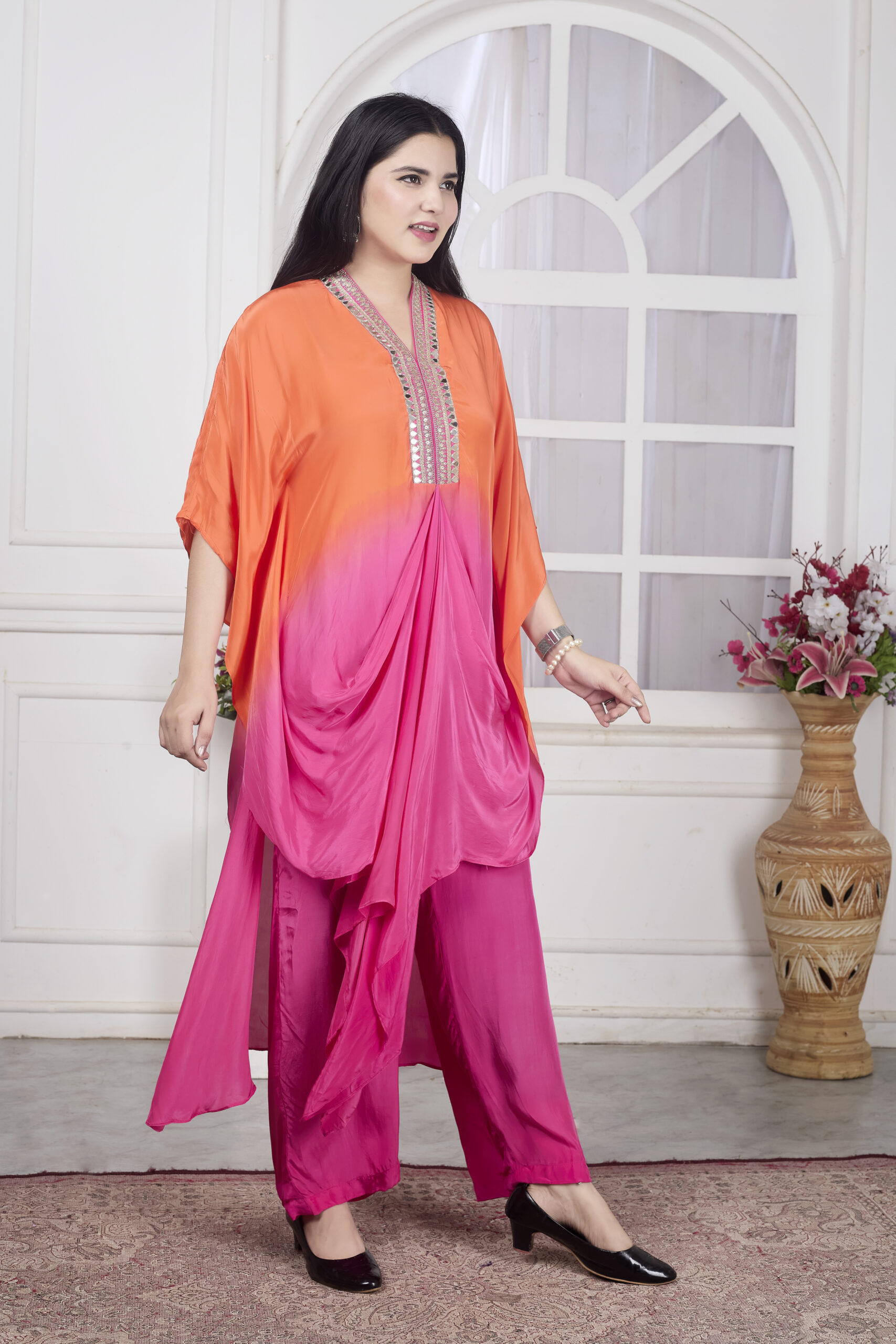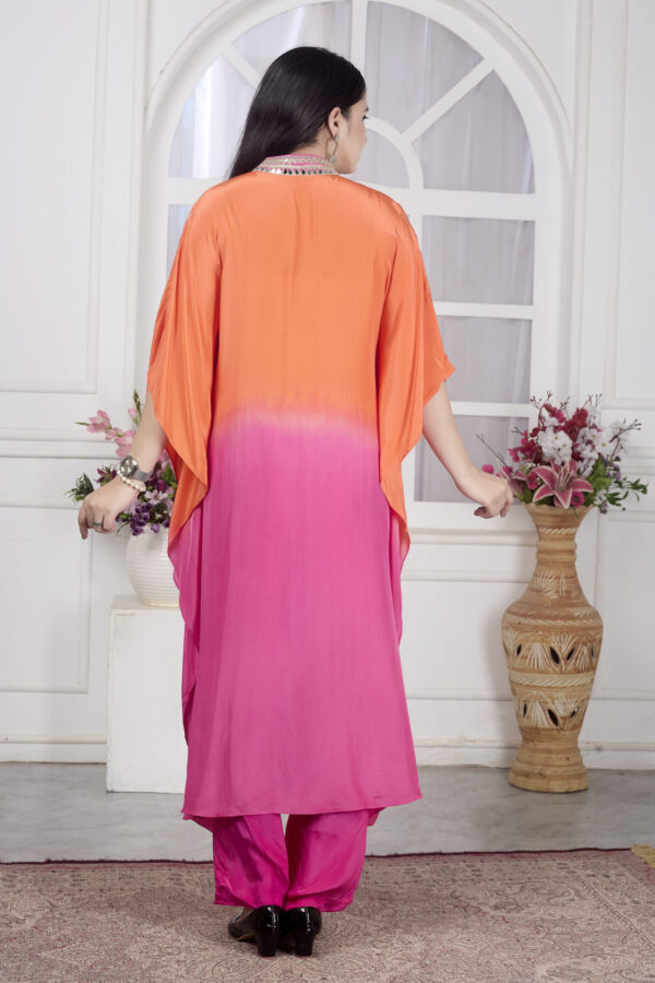 The draped kaftan style looks very elegant and modern. Loved the orange and pink shaded combination.
