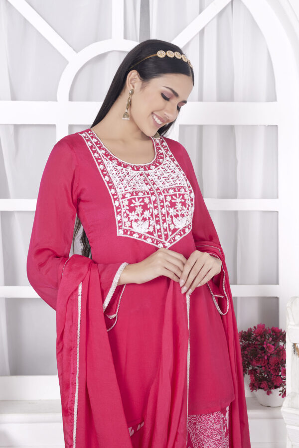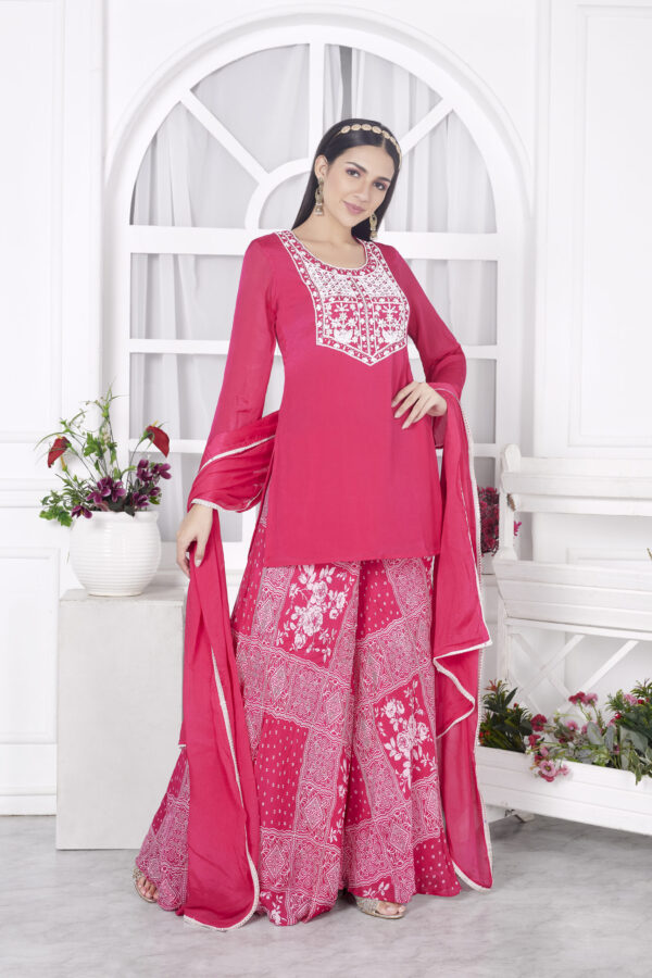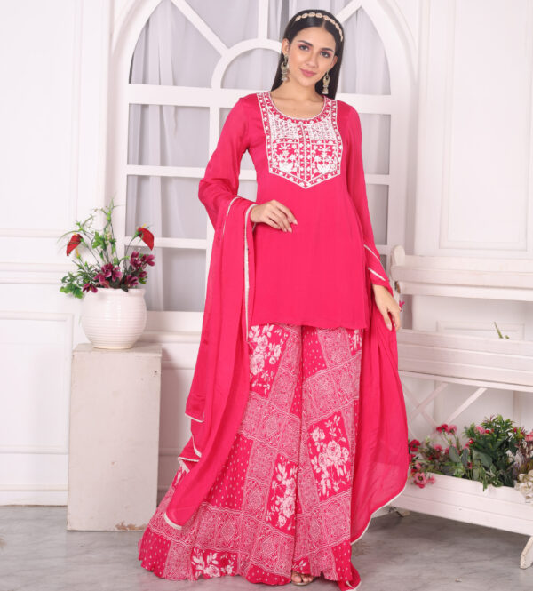 “Embrace timeless charm with our Pink Flared Sharara Set 🌸✨ Featuring exquisite hand embroidery on the front yoke, this outfit is perfect for adding a touch of elegance to your festive wardrobe. The flared silhouette offers a graceful flow, while the delicate detailing showcases unmatched craftsmanship. Step into the spotlight with this stunning ensemble! πŸ’– #ShararaSet #HandEmbroidery #FestiveFashion #EthnicElegance #PinkPerfection”
